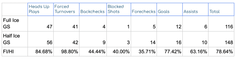 But the “grit behaviors”, backchecks, forechecks, and blocked shots, drop way off on full ice. That’s because half ice creates more: